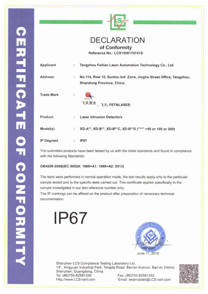• IP67防护等级检测证书