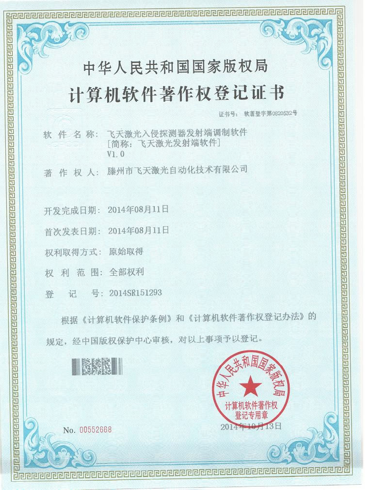 • 飞天激光发射端软件著作权登记证书