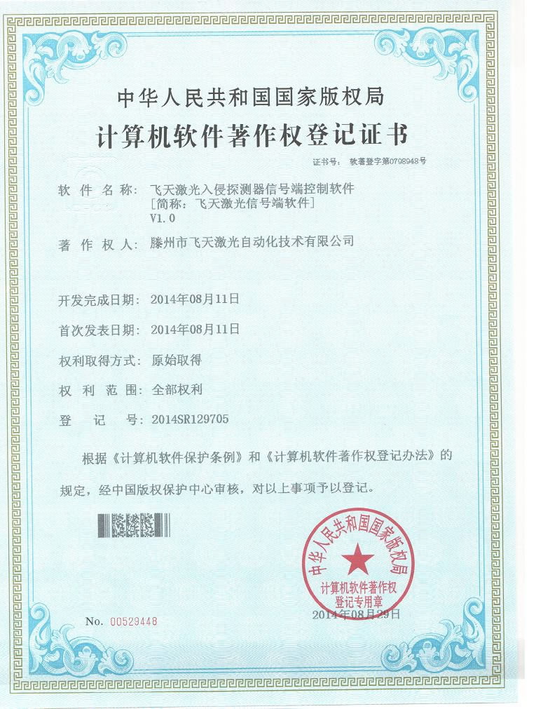 • 飞天激光信号端软件著作权登记证书