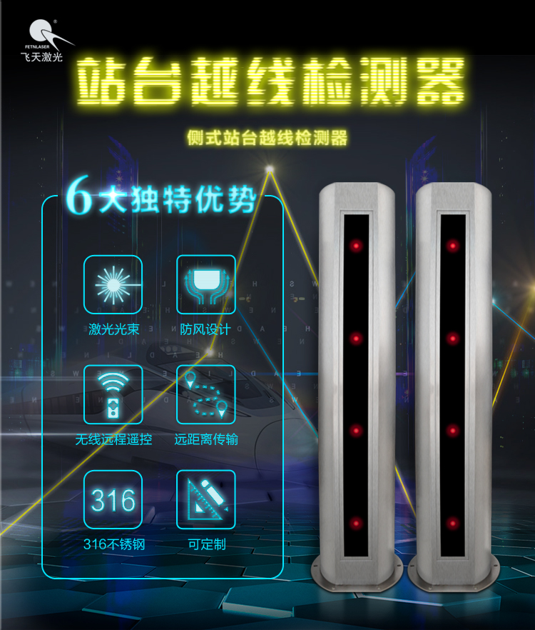 本产品专为空旷无围墙的区域防范而设计,直接安装固定在地面,采用四层对射式结构,以四道不可见光束为警戒线,以每对探测器为防范单元,可连续布设并直接驱动现场声光报警设备。产品具有很强的抗冷热、抗电磁辐射、抗杂散光干扰和适应风、雨、沙、雾等恶劣天气的能力,适合布设在对防范等级要求较高的周界领域。