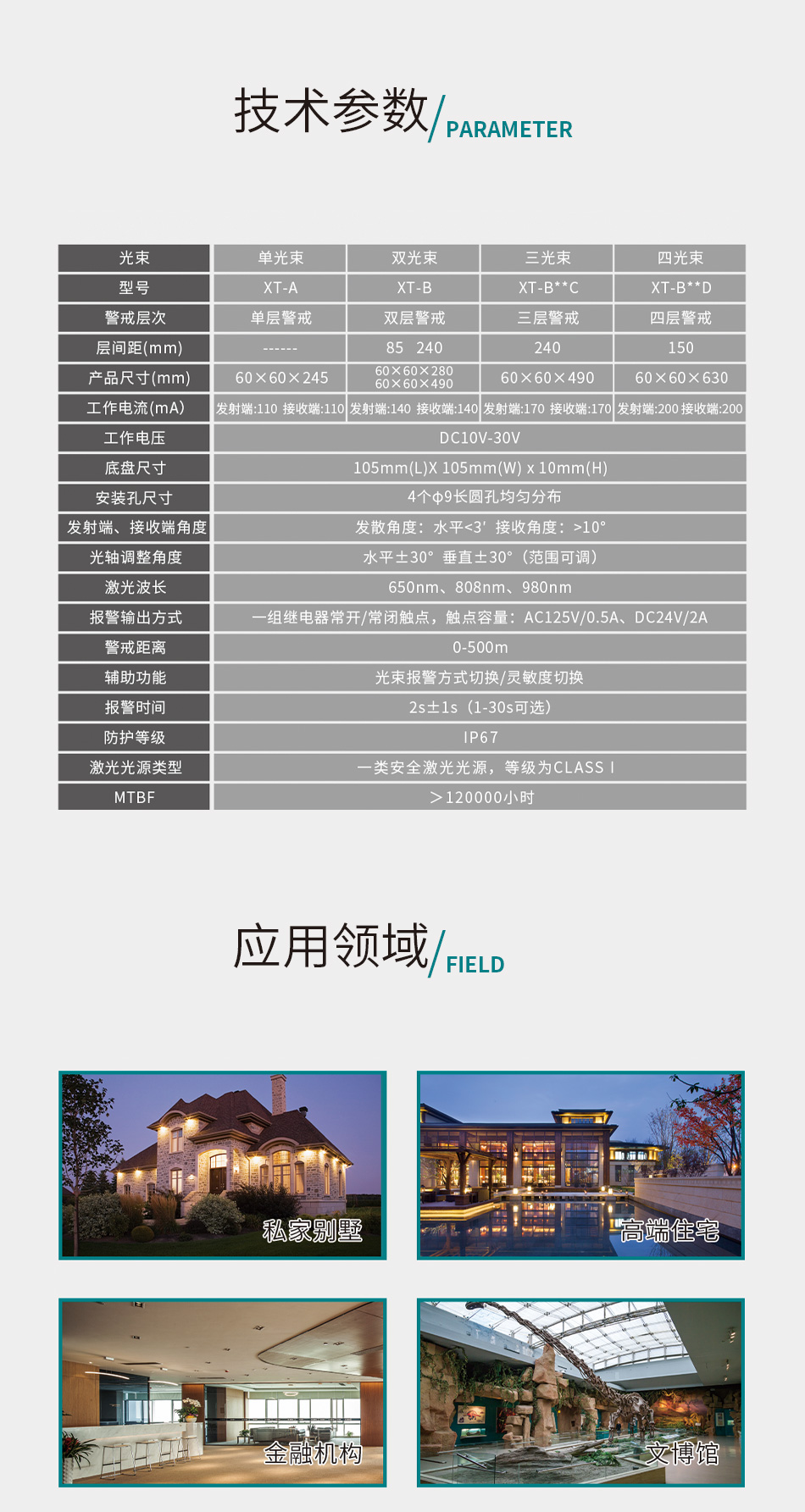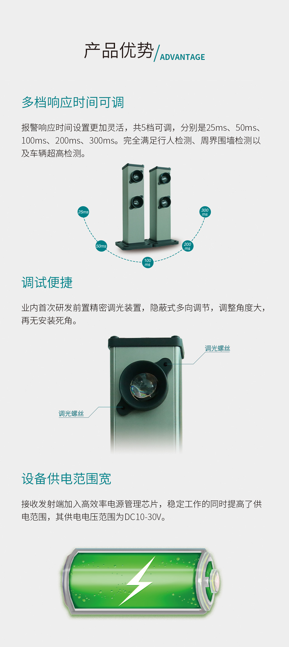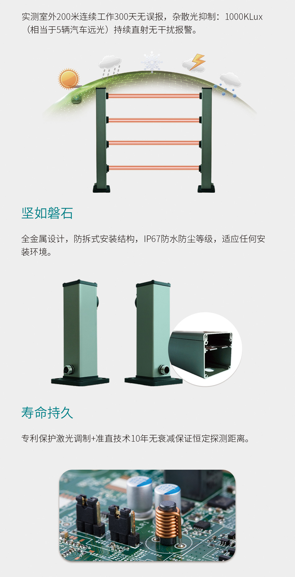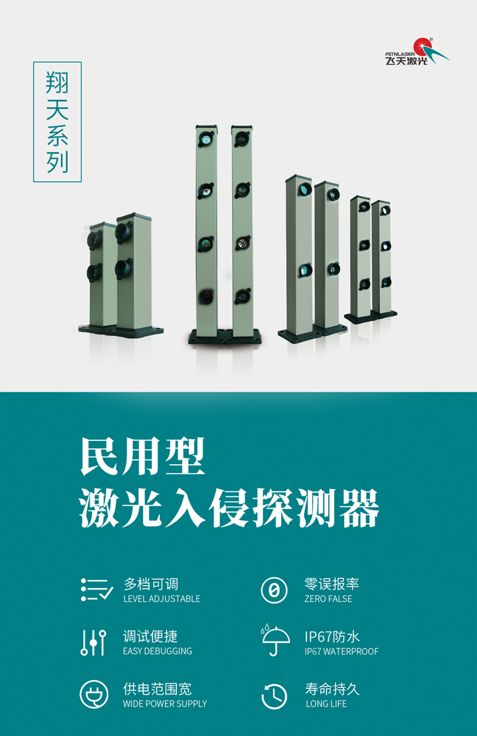 功能特性: 1、多档响应时间可调 报警响应时间设置更加灵活,共5档可调,分别是25ms、50ms、100ms、200ms、300ms。完全满足行人检测、周界围墙检测以及车辆超高检测。 2、调试便捷 前置精密调光装置,隐蔽式多向调节,调整角度大,无安装死角。 3、设备供电范围宽 接收发射端加入高效率电源管理芯片,稳定工作的同时提高了供电范围,其供电电压范围为DC10-30V。 4、寿命持久 采用德国原装进口半导体激光器,光源脉冲编码,恒功率控制,使用寿命长达10年。 5、零误报率 实测室外200米连续工作300天无误报:杂散光抑制:1000KLux(相当于5辆汽车远光)持续直射无干扰报警。 6、坚如磐石 全金属设计,防拆式安装结构IP67防水防尘等级,适应任何安装环境。 相比门磁的易被破坏,飞天激光民用型激光入侵探测器更加牢固,从根源上杜绝被外力强硬破坏的可能,疫情期间防护更可靠!