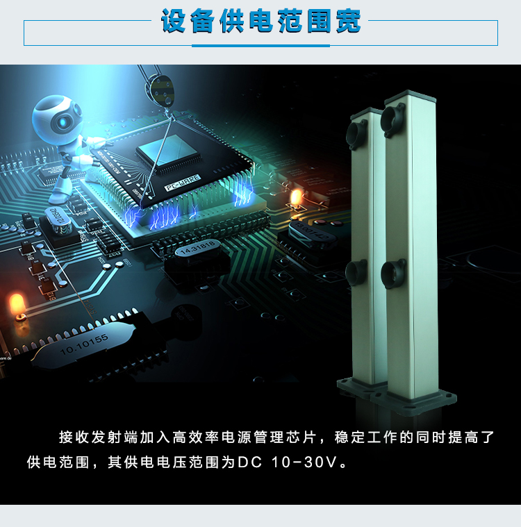 接收发射端加入高效率电源管理芯片,稳定工作的同时提高了供电范围,其供电电压范围为DC 10-30V。