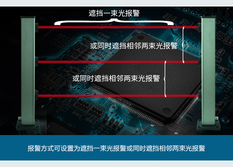 报警方式可设置为遮挡一束光报警或同时遮挡相邻两束光报警。