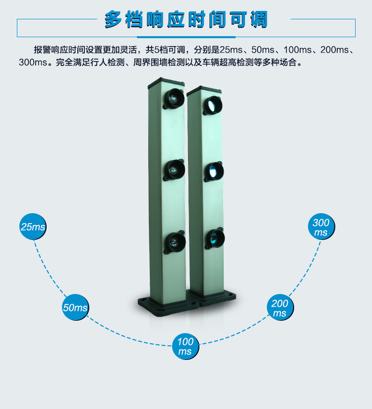 报警响应时间设置更加灵活,共5档可调,分别是25ms、50ms、100ms、200ms、300ms。完全满足行人检测、周界围墙检测以及车辆超高检测等多种场合。