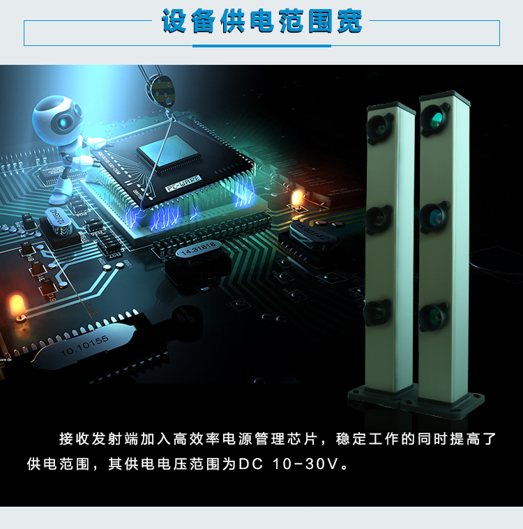 接收发射端加入高效率电源管理芯片,稳定工作的同时提高了供电范围,其供电电压范围为DC 10-30V。