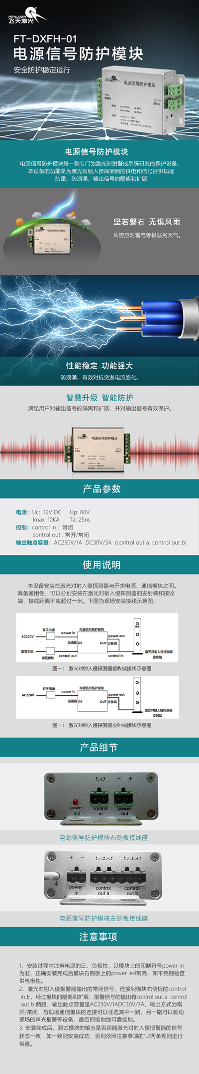 电源信号防护模块是一款专门为激光对射警戒系统研发的保护设备,本设备的功能是为激光对射入侵探测器的供电和信号提供现场防雷、防浪涌、输出信号的隔离和扩展。