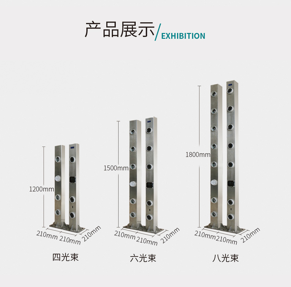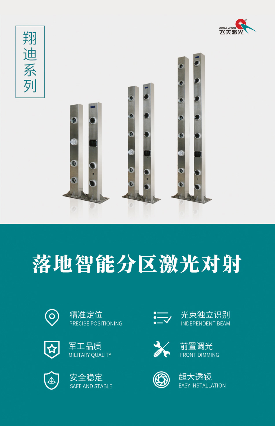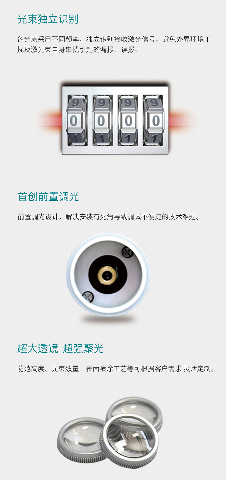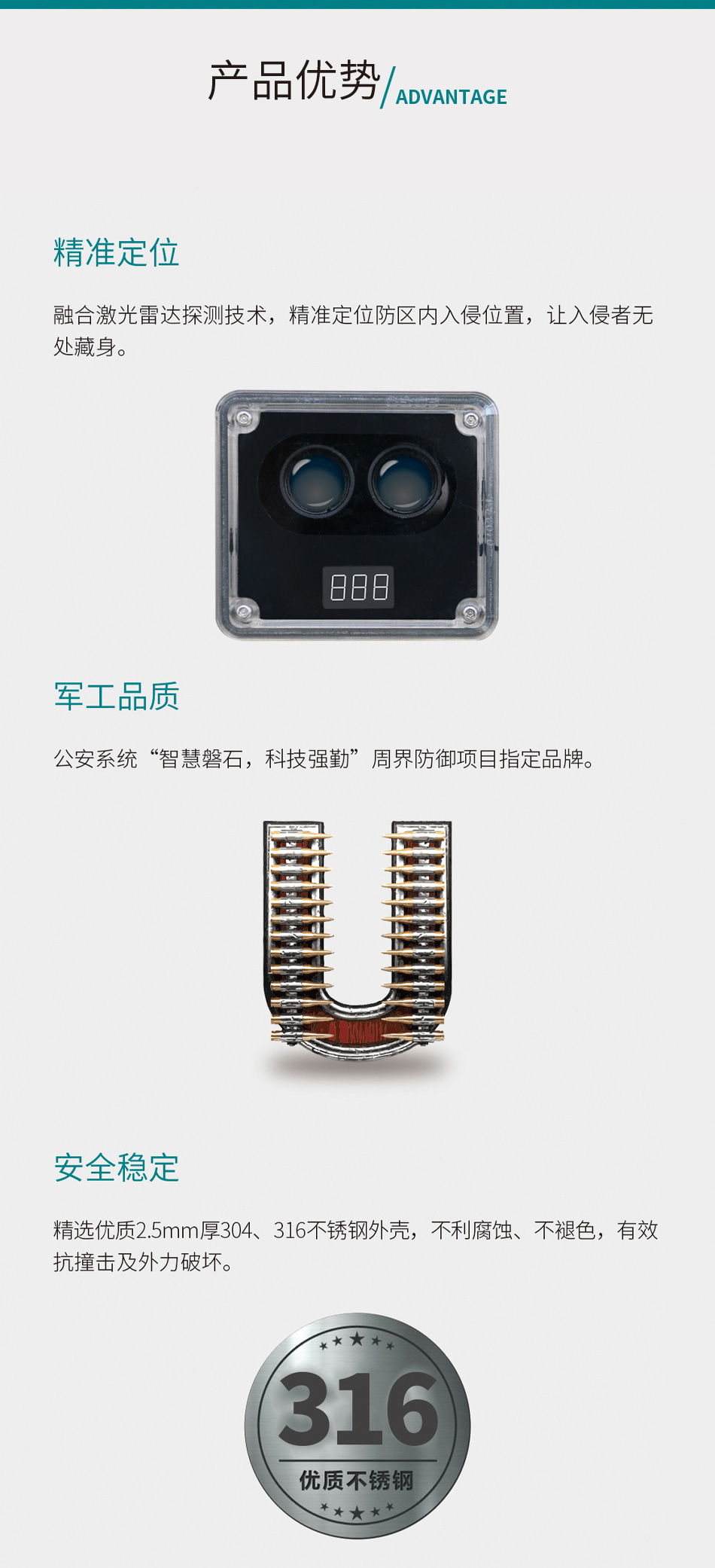 落地式智能分区型激光入侵探测器在周界安防领域的应用优势如下: 1、精准定位:融合精光雷达探测技术,精准定位防区内入侵位置,让入侵者无处藏身; 2、军工品质:公安系统“智慧磐石,科技强勤”周界防御项目指定品牌; 3、安全稳定:精选优质2.5mm厚304、316不锈钢外壳,耐腐蚀、不褪色,有效抗撞击及外力破坏; 4、灵活定制:防范高度、光束数量、表面喷涂工艺等可根据客户需求灵活定制; 5、智能分析:光束身份独立编码,智能识别每束激光信号,主动分析入侵物体大小,判断警情等级,降低误报。 6、现场声光报警:选用高分贝声光警示灯,实现现场声光报警; 7、抗强光干扰:接收端采用专业窄带滤光片+带通滤波技术,有效滤除外界99%的杂散光,不受太阳光、探照灯、汽车强光等光源干扰; 8、首创前置调光:前置调光设计,解决安装有死角导致调试不便捷的技术难题 9、响应时间可调,信号输出多样:报警响应时间多档可调,适用于各种应用环境,满足多种报警需求; 10、采用德国原装进口半导体激光器,光源脉冲编码,恒功率控制,使用寿命长达10年。