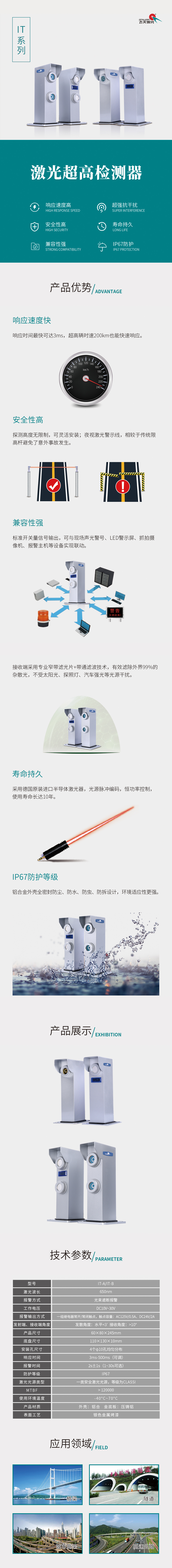 一、技术特点与优势 1、响应速度快:响应时间最快可达3ms,超高车辆时速200km也能快速响应。 2、兼容性强:标准开关量信号输出,可与现场声光警号、LED警示屏、抓拍摄像机、报警主机等设备实现联动。 3、安全性高:探测高度无限制,可灵活安装;夜视激光警示线,相较于传统限高杆避免了意外事故发生。 4、适用领域广:可广泛应用于高速出入口、船闸、隧道、桥梁、城市高架等领域。 5、探测精准零误报:独创PWM激光光源调制技术,探测距离远、穿透力强,能适应雨、雾、霜、雪、沙尘等恶劣天气。 6、超强抗干扰能力:接收端采用专业窄带滤光片+带通滤波技术,有效滤除外界99%的杂散光,不受太阳光、探照灯、汽车强光等光源干扰。 7、IP67防护等级:铝合金外壳全密封防尘、防水、防虫、防拆设计,环境适应性更强。 8、寿命持久:采用德国原装进口半导体激光器,光源脉冲编码,恒功率控制,使用寿命长达10年。