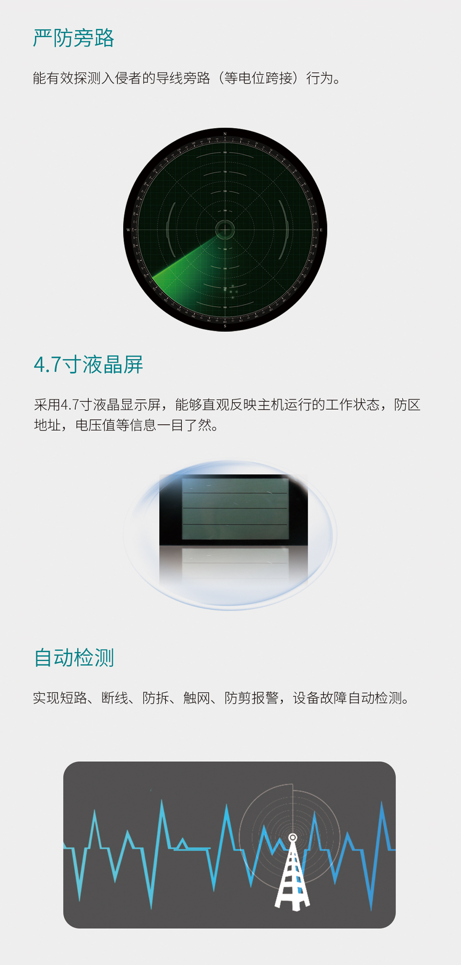 4、自动检测:实现短路、断线、防拆、触网、防剪报警,设备故障自动检测。