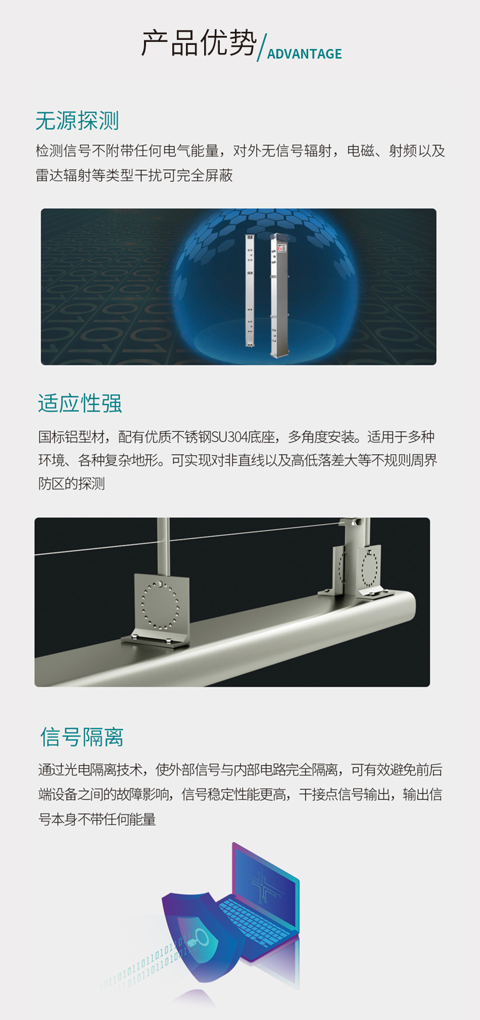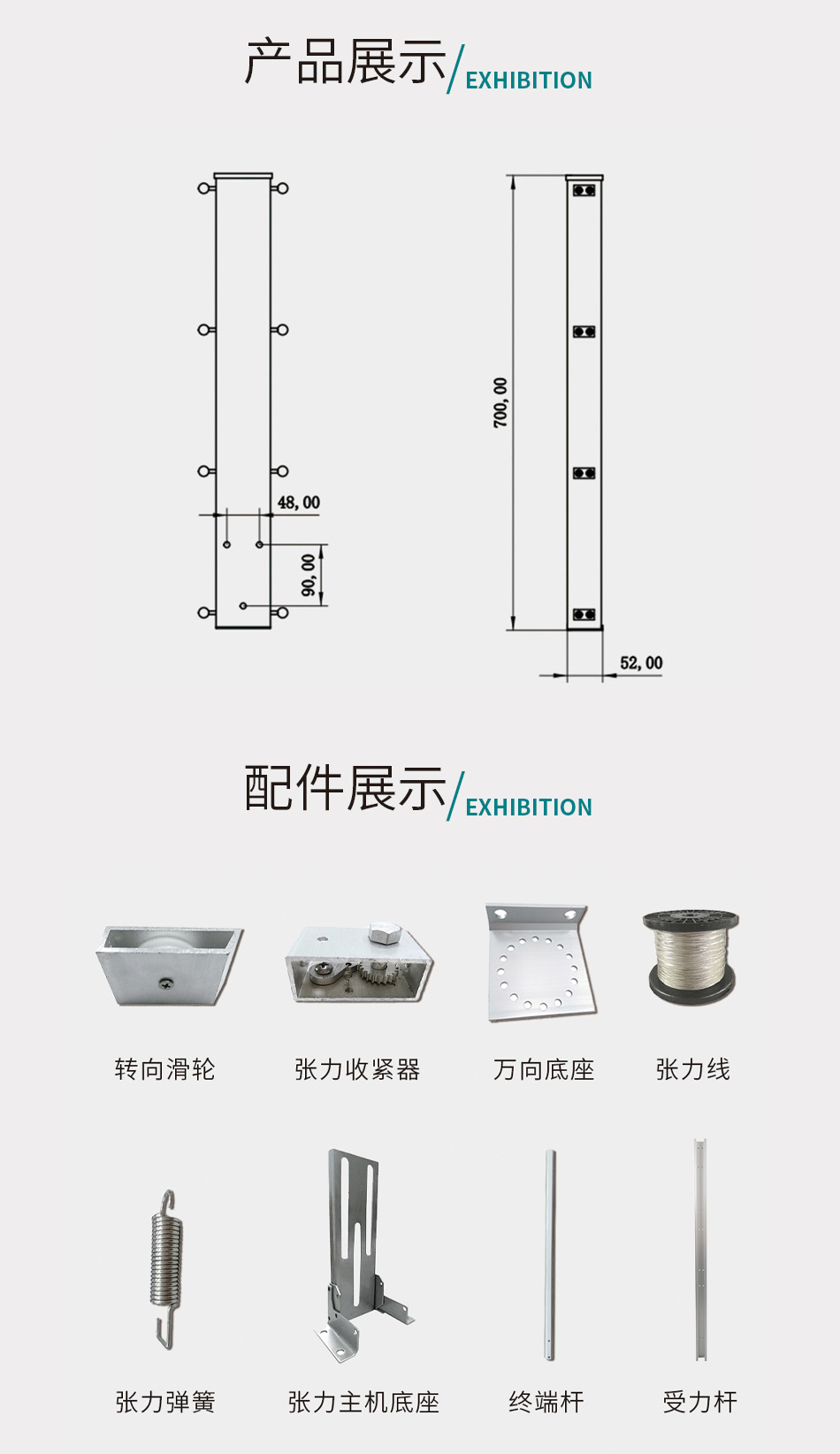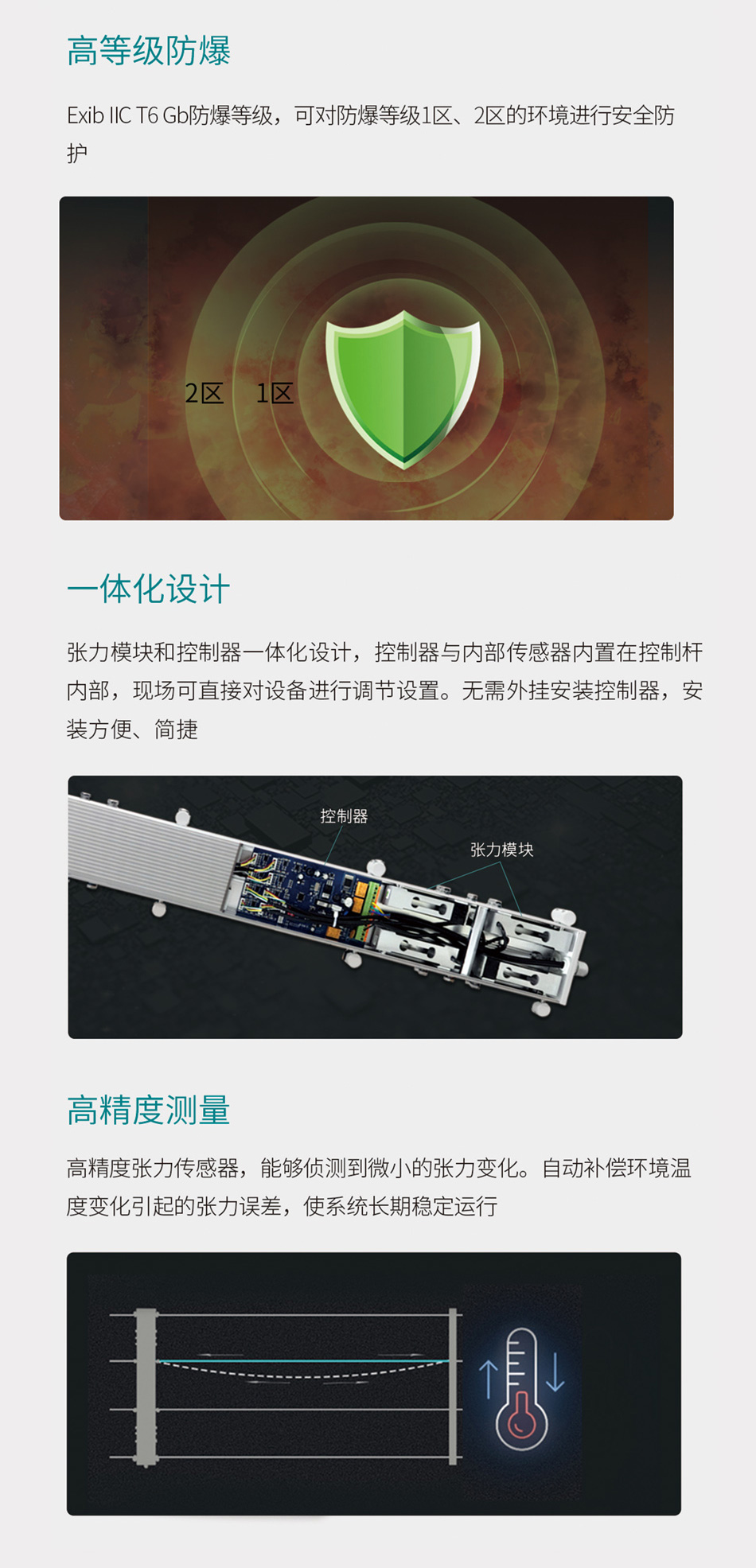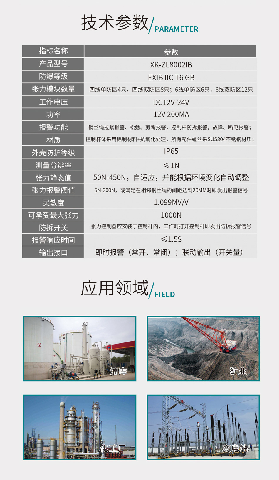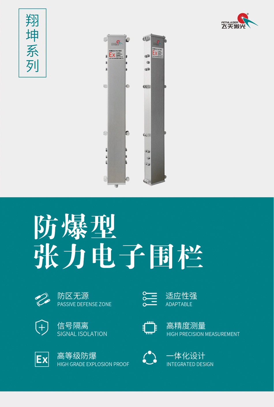 防爆型张力电子围栏是一种防止人体逾越的障碍物和感知攀爬、拉压、剪断障碍物企图入侵的机电装置的集合体,是一种新型的周界防入侵报警设施。由张力探测器、张力控制模块以及控制杆、受力杆、支撑杆、钢丝绳、弹簧、紧固件等组成。防爆型张力电子围栏由于采用全新的探测方式和特殊的信号处理方法,确保环境的变化不会引起张力静态值、张力报警值、张力报警阈值的变化,彻底改变了以往周界安防探测器环境适应性差、易误报的缺点。因此,防爆型张力电子围栏可以在风霜、雨雪、浓雾、沙尘、高温、低温等严酷环境下始终忠于职守,全天候稳定可靠的工作。防爆张力式智能电子围栏加上传输线、报警信号传输控制设备、报警管理中心等设备即可构成一种新型周界防入侵报警系统——防爆型张力电子围栏周界防入侵报警系统。