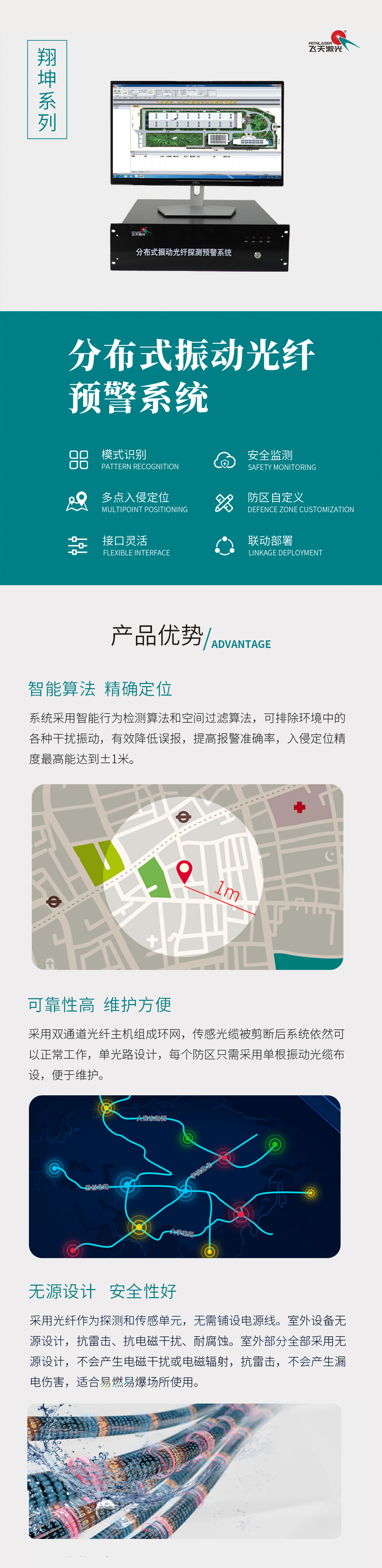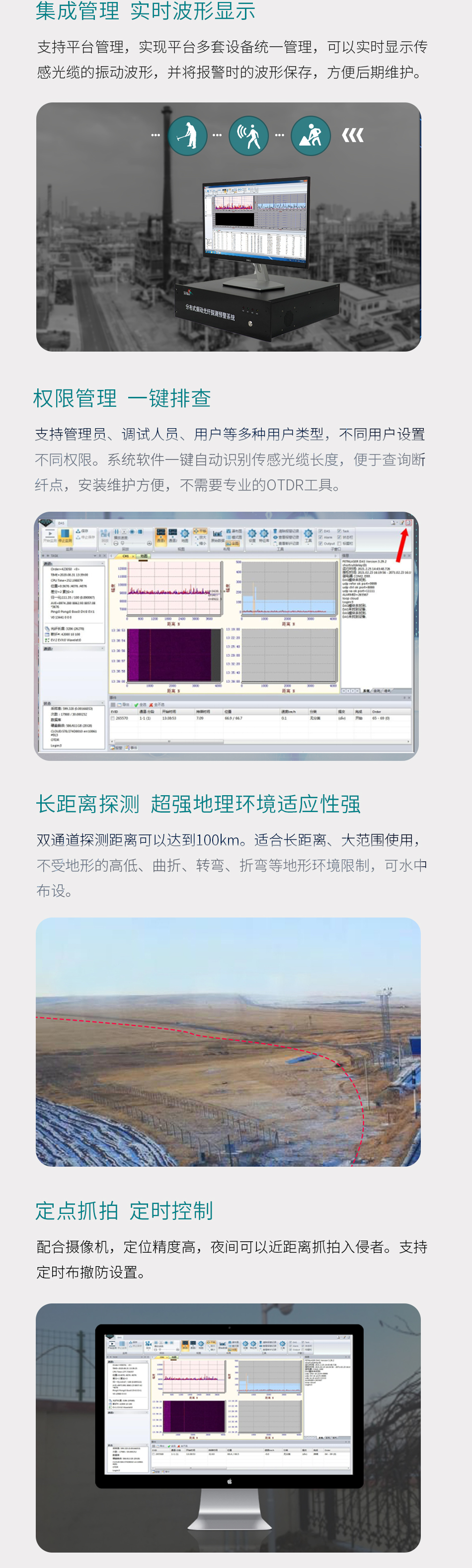 分布式振动光纤系统是BG大游中国官方网站研制的新一代光纤探测系统,能同时定位多个入侵点,采用光纤传感,若光缆被剪断,断点之前部分可正常工作,并能定位到断点位置。系统以传感光缆作为传感单元,能通过对直接触及或通过承载物(如覆土、铁丝网、围栏等)传递给振动光纤的各种振动,进行实时、持续的监控,采集数据经光通讯传递给后端设备分析处理和智能识别,报警信号。