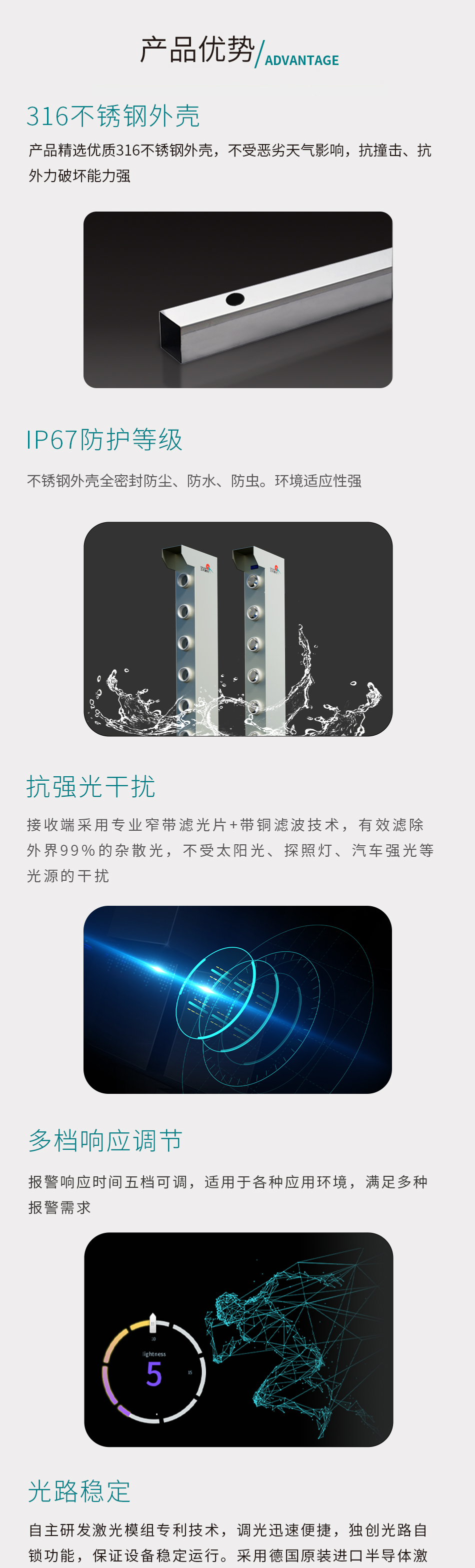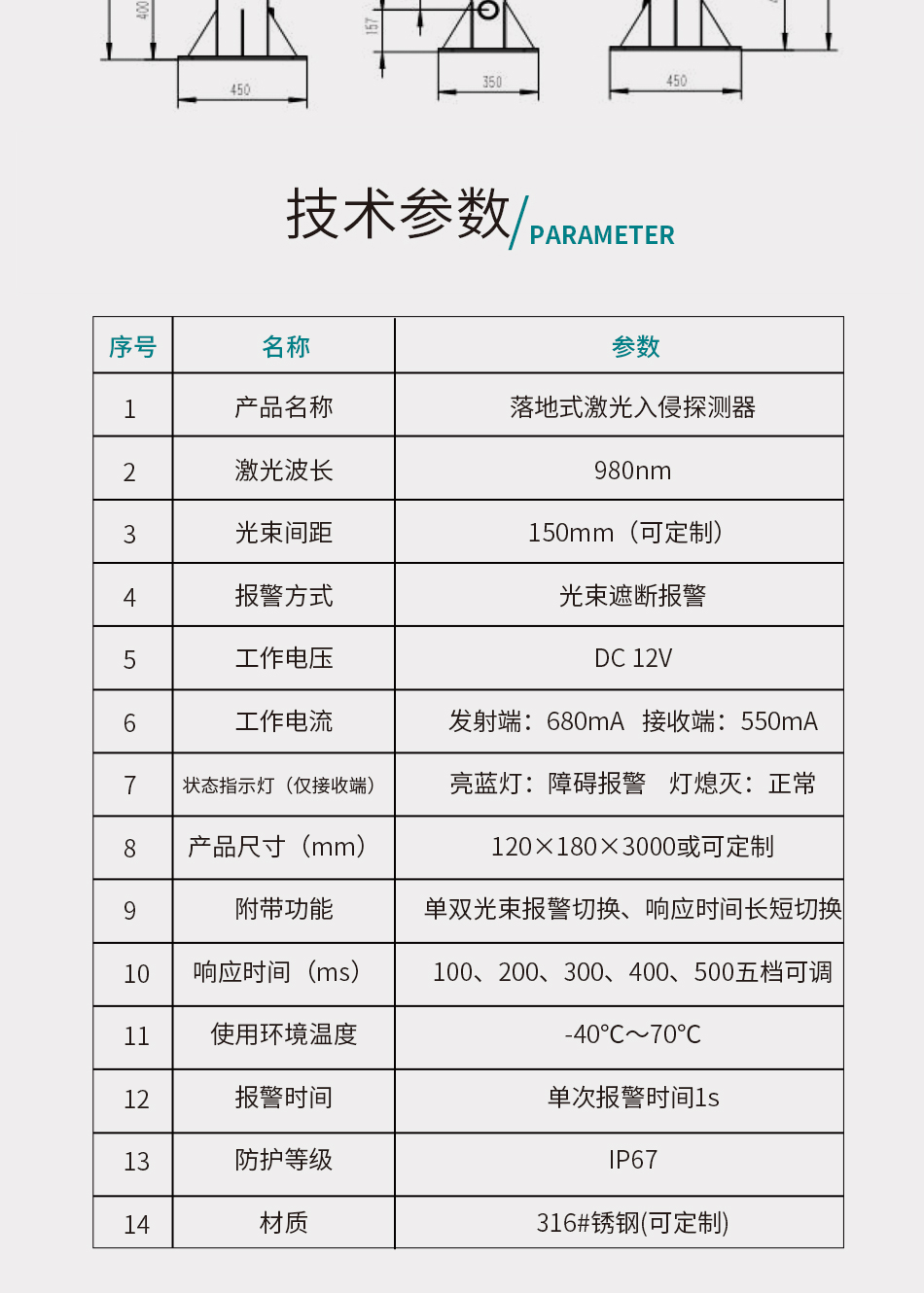 激光波长 980nm 光束间距 150mm(可定制) 报警方式 光束遮断报警 工作电压 DC12V 工作电流 发射端:680mA 接收端:550mA 状态指示灯(仅接收端) 亮蓝灯:障碍报警 灯熄灭:正常 产品尺寸(mm) 长×宽×高(120mm×180mm×3000mm)或可定制 附带功能 单双光束报警切换、响应时间长短切换 响应时间 100ms、200ms、300ms、400ms、500ms五档可调 使用环境温度 -40℃~70℃ 报警时间 单次报警时间1s 防护等级 IP67 材质 316#锈钢(可定制)