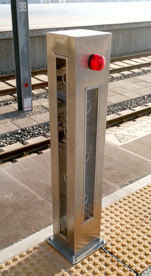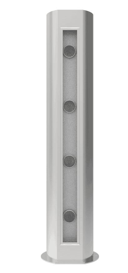 控制主机接收到报警信号后,会根据系统设置启动整个站台沿线的语音报警音柱,自动播放越线提醒语音:“您已越线,请后退!”(语音内容可定制),站台越线指示模组对应的指示灯会亮起,且蜂鸣器常响,同时地埋爆闪灯闪烁起到及时提醒越线旅客的作用。工作人员听到报警音柱(见图2-2-3)发出越线提醒语音,配合站台监控可以进一步通过语音喊话劝阻、制止越线旅客,退到安全黄线以内,确保人身安全和保障列车正常运行。