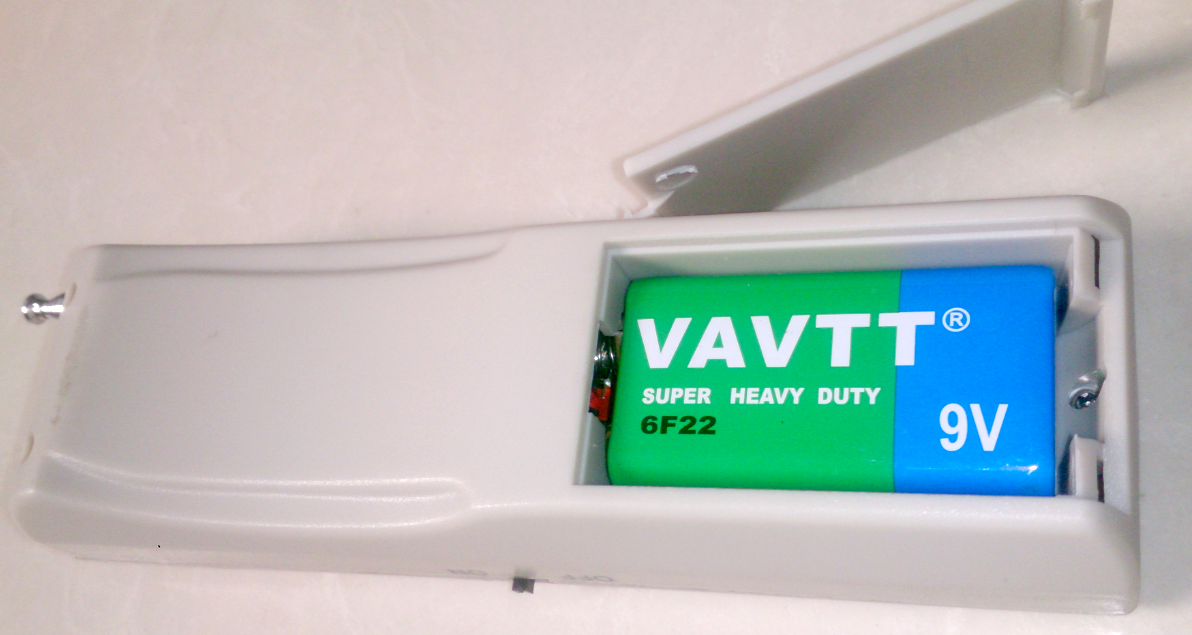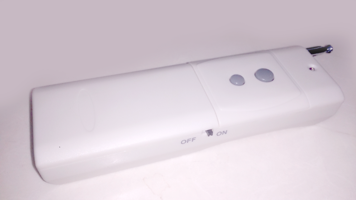 发射模块整体尺寸为145*43*25mm,抽拉式天线,按键个数根据应用场景进行选择,天线拉出后总长度为240mm。外壳背部曲线设计,握持手感舒适,右侧设计有电源开关,背部电池仓盖推拉式结构,电池型号为9V方形电池可更换,正面顶部设计有信号发射指示灯。发射模块实物如图3-4-2所示:
