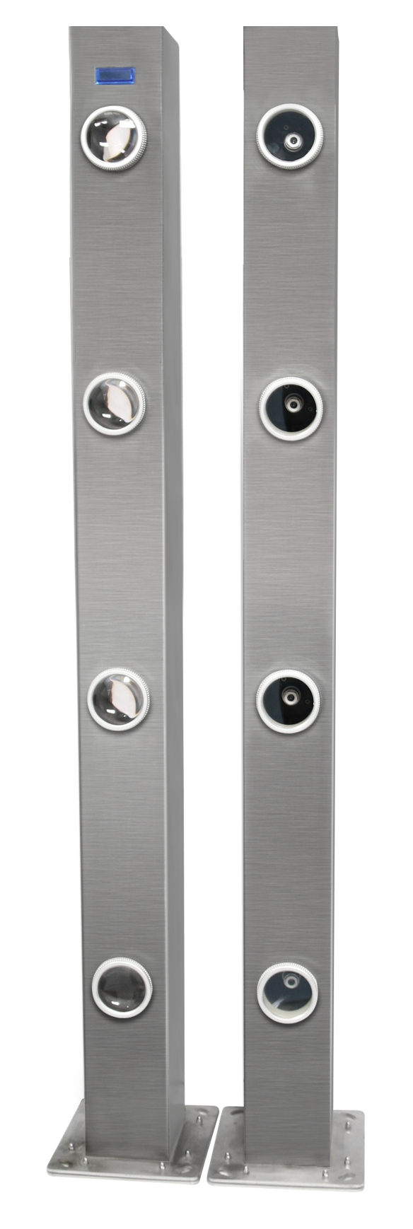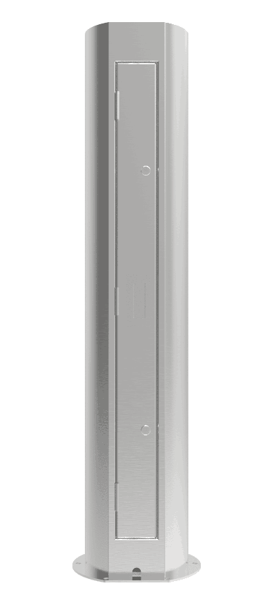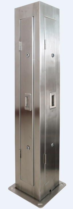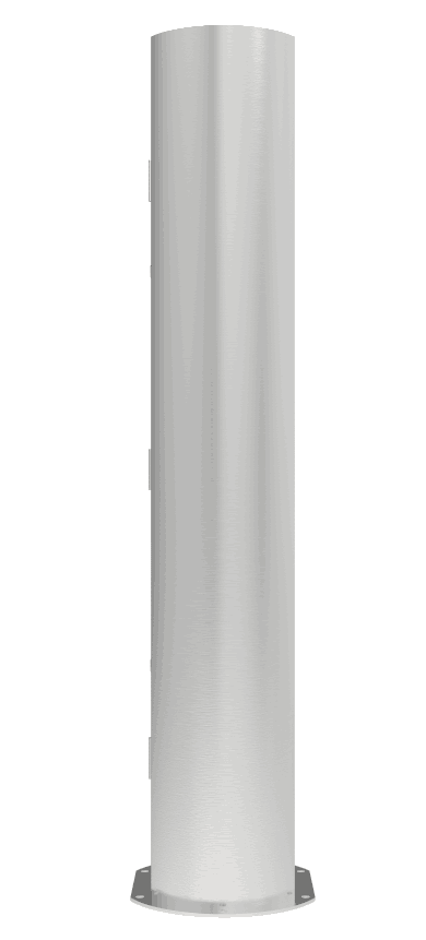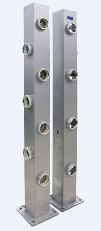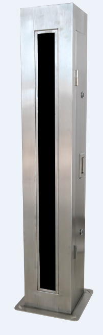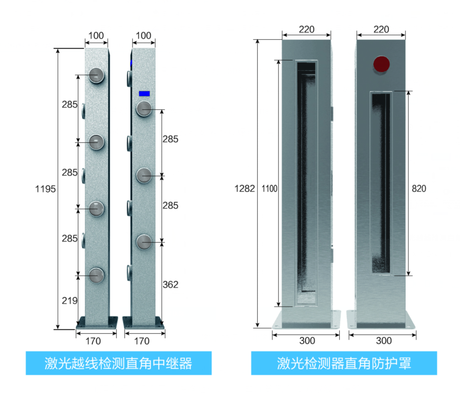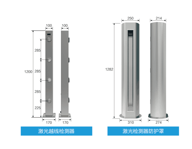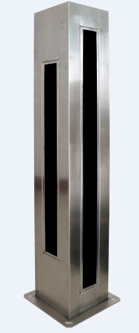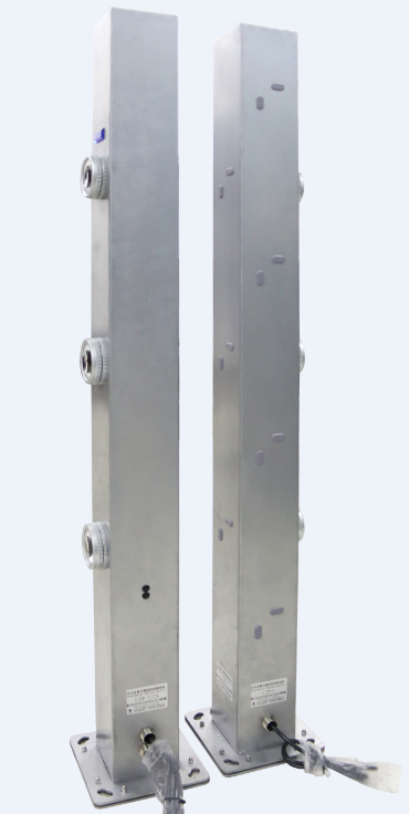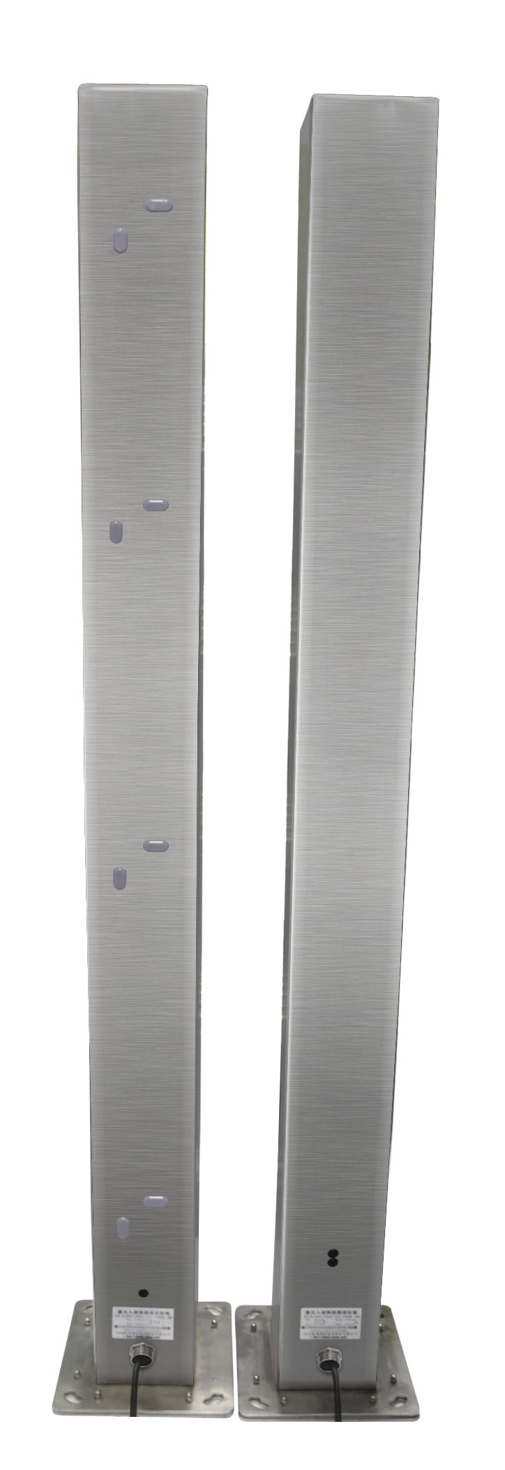 激光越线探测系统是山东飞天激光光电科技有限公司根据铁路站台、生产车间、考古现场、临时警戒等应用领域开发的一款以激光光源作为检测媒介的新型产品,单站台越线检测部分选用本公司激光对射系列产品中的一款落地式4光束产品,型号为XD-B500DL(见图3-1-1)。该款产品四层对射式结构设计,长*宽*高具体尺寸为100*100*1200mm,不锈钢材质外壳,表面烤漆处理,室外长期使用确保不易变形不易老化,外壳防护等级IP67;底盘长*宽*高尺寸为170*170*8mm,采用8mm厚度的钢板做底盘确保长期安装不被螺丝拉弯拉变形。