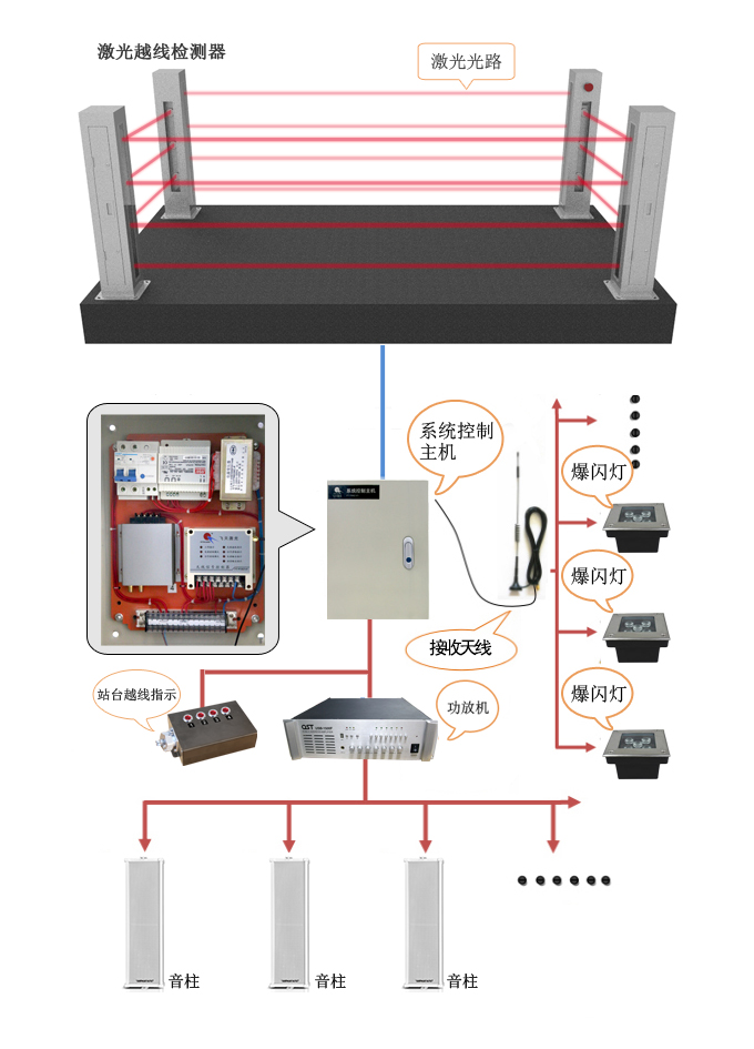 单防线系统分激光越线探测、越线报警信号处理、自动语音和灯光提示、远程喊话四大功能部分。激光越线探测功能的核心是激光对射,越线信号由激光越线探测器发出,通过有线的方式传输给控制主机,控制主机将信号分析、处理后驱动站台全线爆闪灯闪烁和语音报警音柱,进行提示或警告语音的播放。语音提示功能主要由大功率专业广播功放驱动语音报警音柱实现,每个控制主机内有已经固化好的语音文件。语音报警音柱根据整个站台长度安装,间隔距离越近整个站台的声音越响亮,整体效果表现越好。广播功放具有远程喊话功能(需要选配麦克风),可以在值班室进行远程喊话,以警示旅客;整个系统的启动或关闭可通过无线遥控器远程控制。