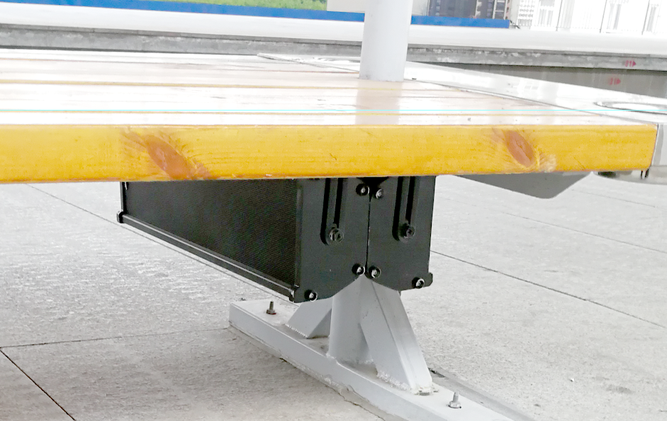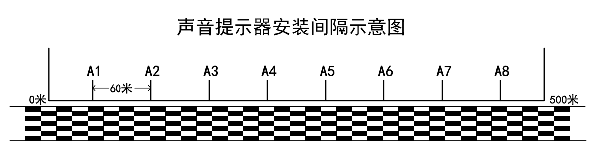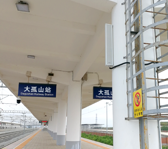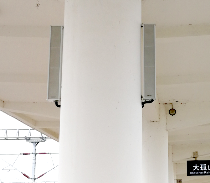 单个语音提示器额定播放功率为100W(50W可选),工作电压支持AC110V,长*宽*高尺寸为856*150*82mm。因站台较空旷、声音衰减幅度大,根据现场体验,语音提示器要求每间隔60米左右安装一个,一般500米长度的铁路站台需安装8个左右,如图3-5-3所示。
