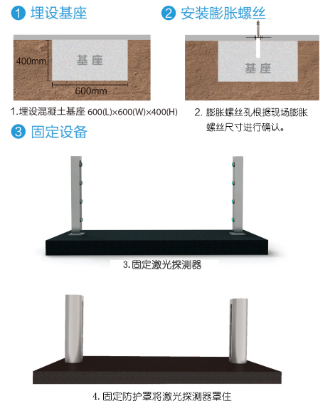 激光越线探测器的安装需要4颗螺栓尺寸为M8*80mm膨胀螺丝直接固定在地面上或安装在支架上(现场地面无法直接安装的需要支架),要求地面为坚硬平整的混凝土结构或石基结构。
