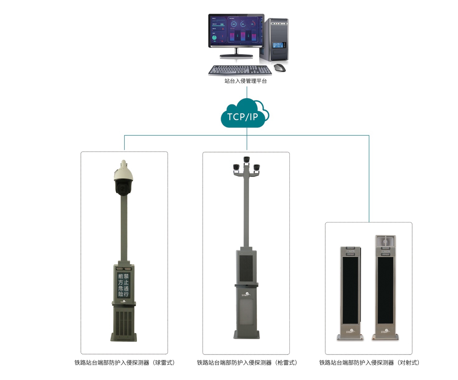 铁路站台端部防护系统由前端站台端部防护入侵探测器、TCP/IP网络传输系统、站台入侵管理平台组成。
