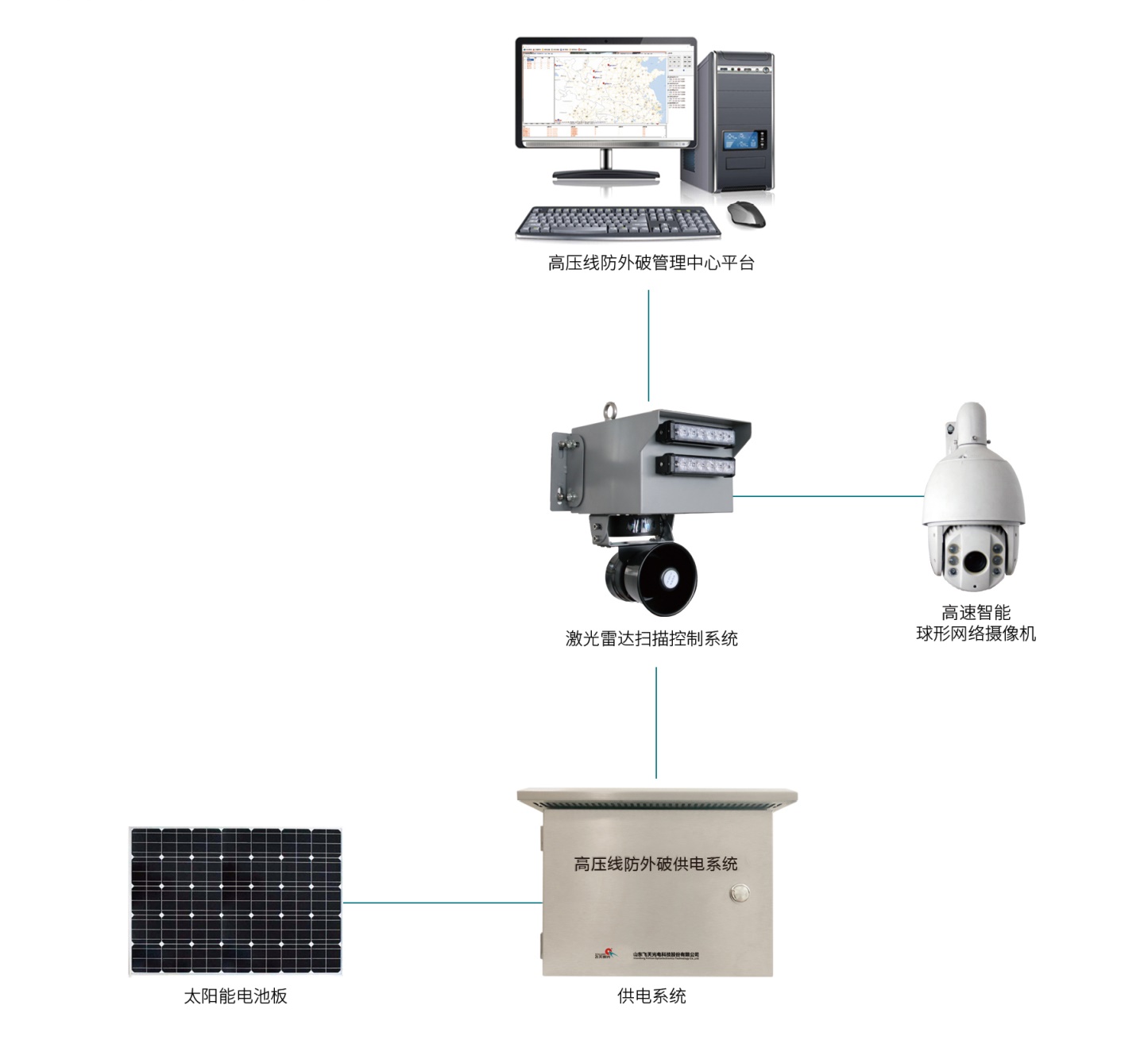 系统包含激光雷达扫描监测器、报警控制主机、高速智能球形网络摄像机、语音提示器、现场警示灯、太阳能电池板、后台计算机或管理员手机、配套的中心客户端软件等。