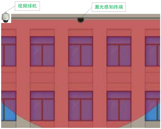 在重点建筑物(如监舍)外楼顶部部署1套激光雷达探测器,实现对于建筑物墙面窗户的垂直防护,若有人想要出入窗口时,可立即发现目标报警并驱动视频进行跟踪。