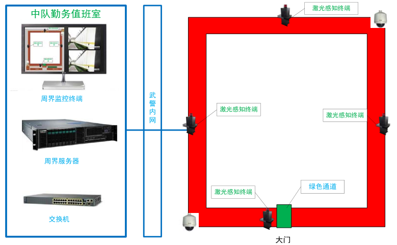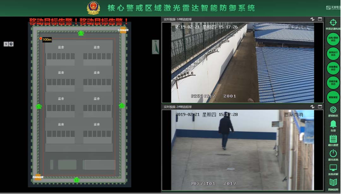 监所地面应当包括活动地面和围墙内通道,在值班室安装周界服务器1台、周界监控终端1台、监墙地面及围墙内通道各部署4台激光雷达探测器,实现地面区域及监墙内通道无缝警戒防护,一旦有人入侵,可立即发现目标报警并驱动球机进行跟踪。