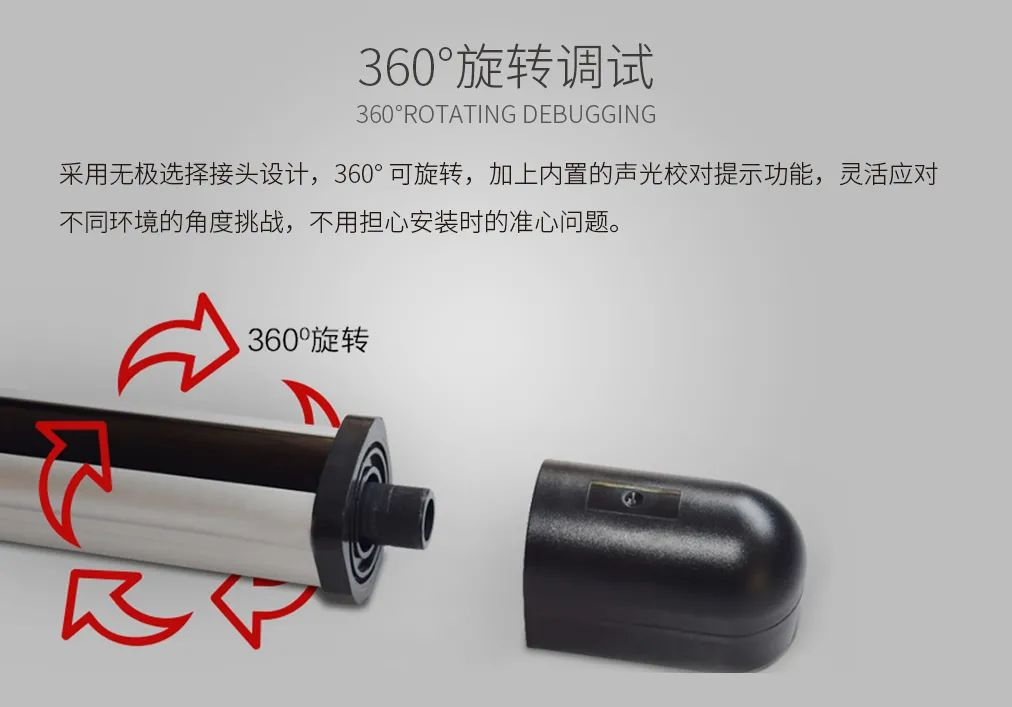 ● 安装调试方便:安装座固定后红外光束的发射和接收视角均可实现360°无级旋转,无需抽出整机基板便可实现接线安装。可根据安装距离调整发射功率大小。