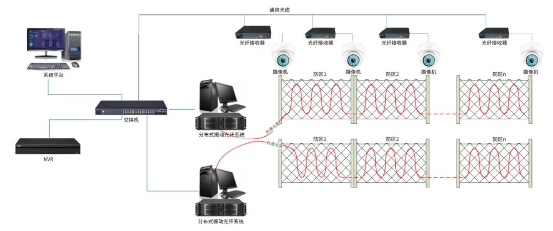 同时分布式振动光纤系统与视频监控联动,在入侵报警系统输出报警信号时会启动摄像头对报警区域进行录像监控,将监控画面长期保存,为事后取证留下可靠证据,建设全方位立体防范系统。